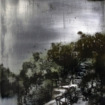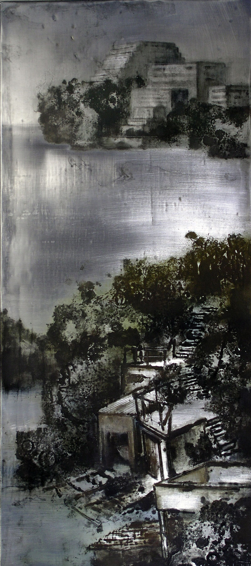 Sus pinturas y serigrafías sobre zinc y aluminio, tienen frente a la luz y el movimiento del que las observa, una cualidad especular que también reacciona ante los filtros cromáticos (esos tonos fríos o calientes que impone la iluminación). Y aquí, volvemos a la metamorfosis, a la reinvención del paisaje. Aunque, en muchos casos, el punto de partida fue una toma fotográfica (como si fuera un casting de imágenes y los cuadros personajes a los que se les buscó la escenografía más adecuada), intuimos y luego comprobamos que los territorios oníricos terminaron por imponerse.